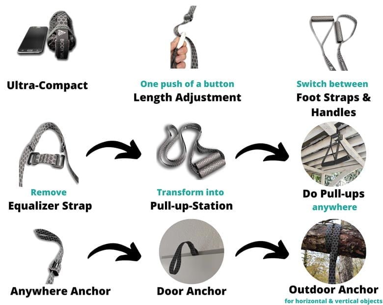 A Gym smaller than a water bottle. Comes in a heavy-duty storage bag and weights only 485g / 17 oz.